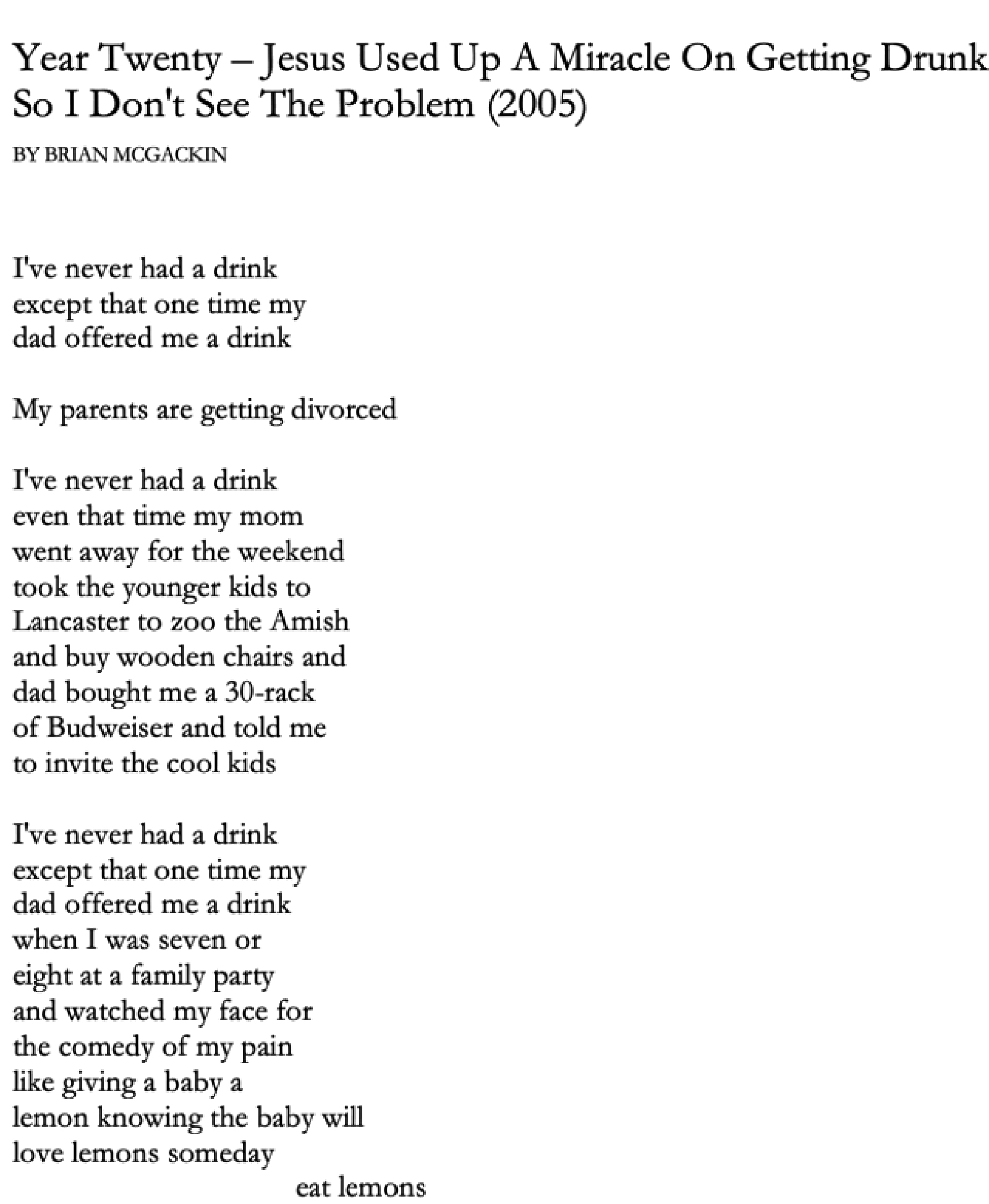 Brian McGackin is the author of Broetry (Quirk Books, 2011) and In Case of Death (Not a Cult), 2018). He has a BA from Emerson College in Something Completely Unrelated To His Life Right Now and a Masters in Poetry from USC. His work has appeared in places such as Huffington Post, New York Daily News, LitReactor, Drunken Monkeys, and The Prompt Mag. He lives in Los Angeles, where he enjoys Guinness, comic books, soccer, and classical music.