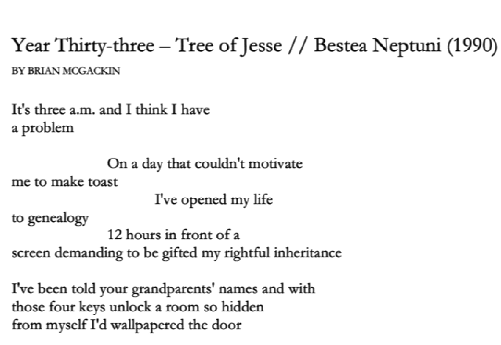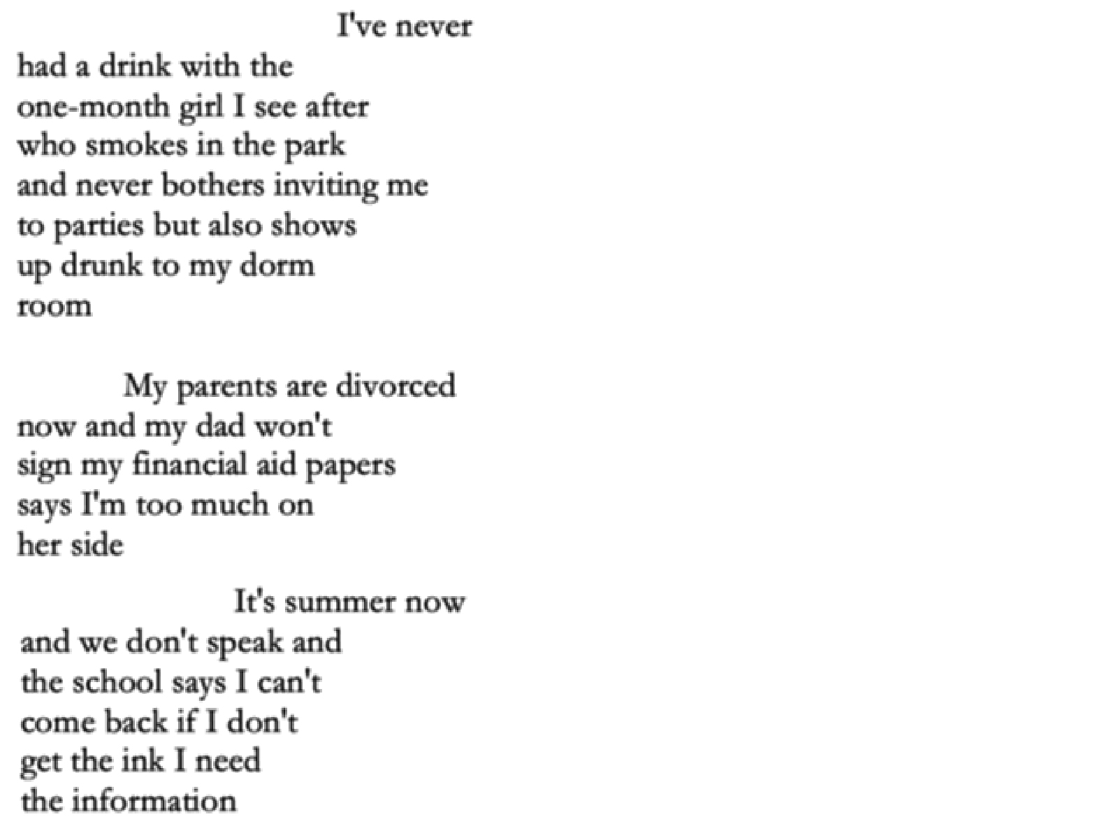 He writes: “These poems come from a collection I’ve recently completed titled ‘Father // Son // Ghost,’ about the death of my estranged biological father only a few months after we finally met. As with most of my poetry, the concept for the collected work came before the individual poems, and I wrote towards that desire. I’ve always enjoyed reading collections where the individual poems feel as though they couldn’t possibly appear in any other book, where the context of the other poems and the collection as a whole offers another layer of meaning. While many of the poems in ‘Father // Son // Ghost’ can stand on their own, I feel that they offer more to the reader when read together.”